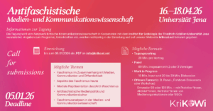 Das Netzwerk KriKoWi lädt zur Frühjahrstagung 2026 nach Jena ein. Willkommen sind Beiträge in verschiedenen Formaten, die sich kritisch mit kommunikationswissenschaftlichen Themen auseinandersetzen.